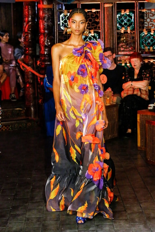 Just an hour before arriving, Aiden – who is signed with Next – had been walking the Peter Pilotto show a short distance away and, saving the the fuss for another time, the daughter of revered French model Katoucha Niane stepped right out in her catwalk look. The gown was a vivid floral-print Organza floor-length asymmetric dress, which she wore with the earrings featured in the show too, bringing a whole new meaning to fresh off the runway.